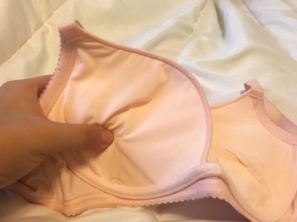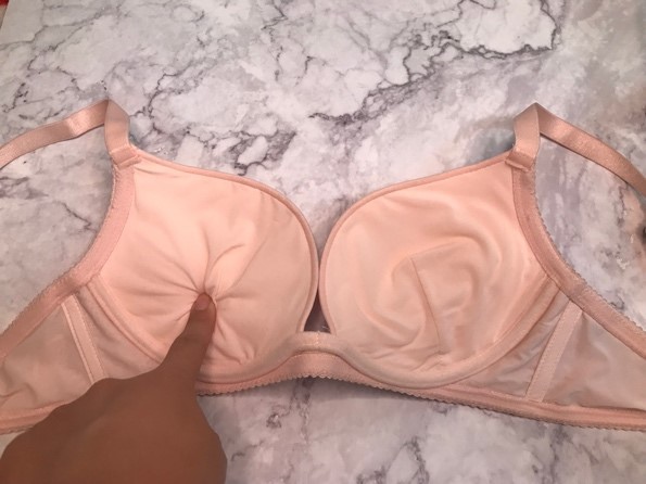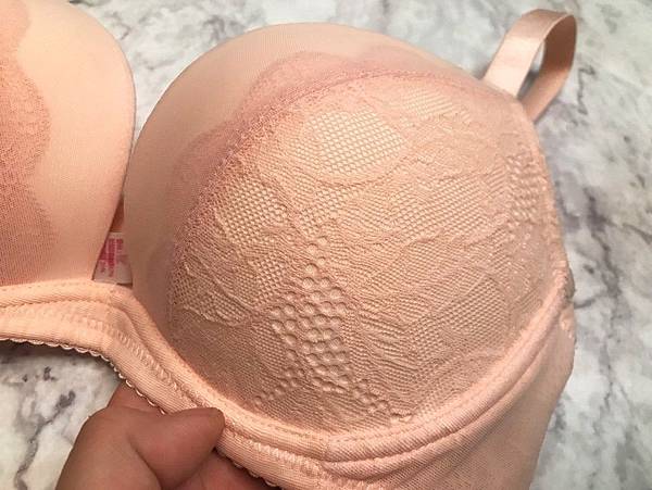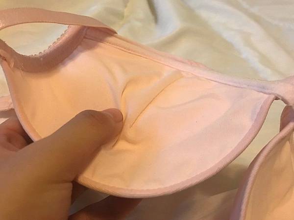 原來 就是因為罩杯內部的軟墊設計,有一個神奇的弧度,我手壓的這邊就比較厚一些,剛好完美地把肉肉往上推擠!再搭上沒有緊密靠攏的前片,於是就有了「法式深V」的稱號啦 (原來如此)