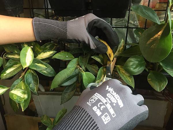 因為植物有根莖葉,裡頭會有汁液的傳導,整理花卉的時候,我會把乾枯或是凋謝的部分摘除掉,有時候手上會留下植物的汁液,黑黑綠綠的樣子,每次都要清洗好久,才會完全乾淨,現在我可以透過手套,把每一處不健康的葉子、花朵、枝幹,一併除掉且手上完全不留痕跡,簡直方便極了。